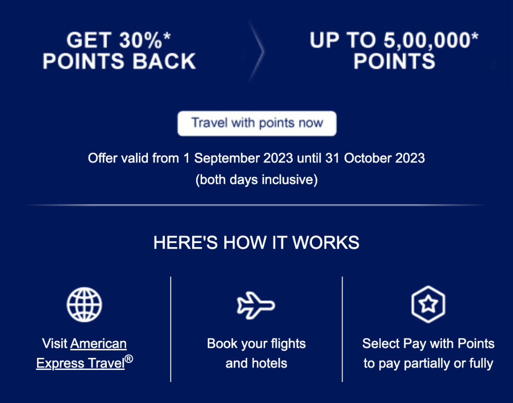 - Offer: Get 30% points back on making a travel booking using the Amex Travel portal