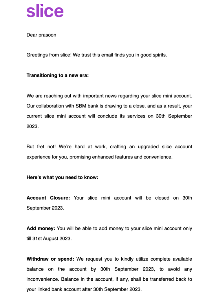 Post 30th Sept, the Slice Mini prepaid card will be closed and all the funds that are unused would be transferred back to the account linked to Slice Mini. Below is the official communication from Slice and SBM Bank India (SBM Bank India is a subsidiary of the State Bank of Mauritius)