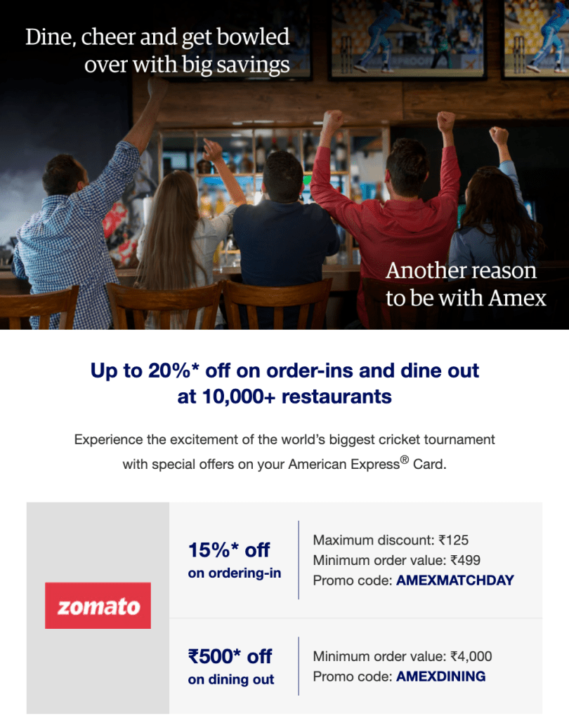 Amex has partnered with Zomato to give a mouth watering offer during this cricket world cup season. The offer is valid on food delivery as well as dine-in. The offer is valid on the days when India cricket team has a match. Below are the offer details-