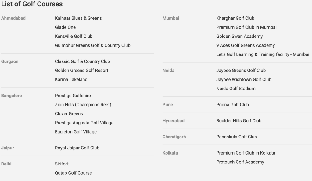 You can book a golf lesson using Axis Extraordinary Weekends portal at any of the Golf courses that you see below. For detailed terms and booking process refer this.