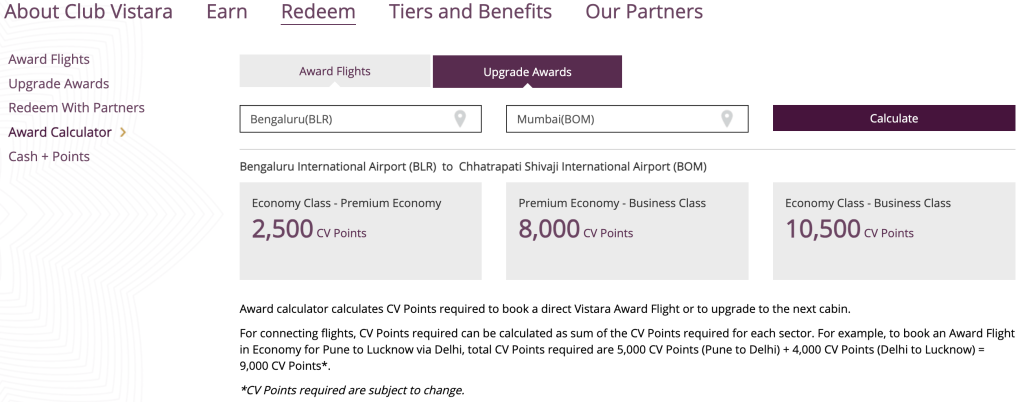 Now we know all about how we earn the points. Let’s see how we can burn the points. As mentioned earlier, you get the points and the vouchers credited to your CV account which can be used for travel bookings. Ensure to do the bookings at least 10 days in advance to get the award seats as availability is limited. Also, it depends on the season and the sector you want to book.