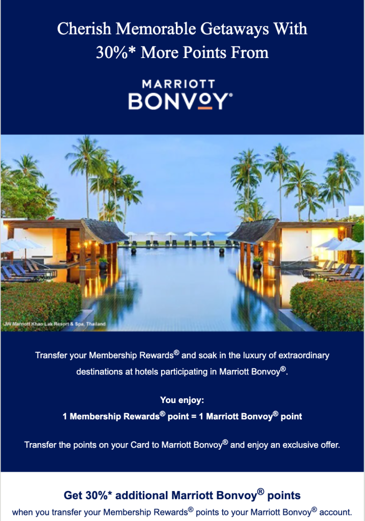 | Offer | Get 30% extra points on transferring Amex MR Points to Marriott Bonvoy |