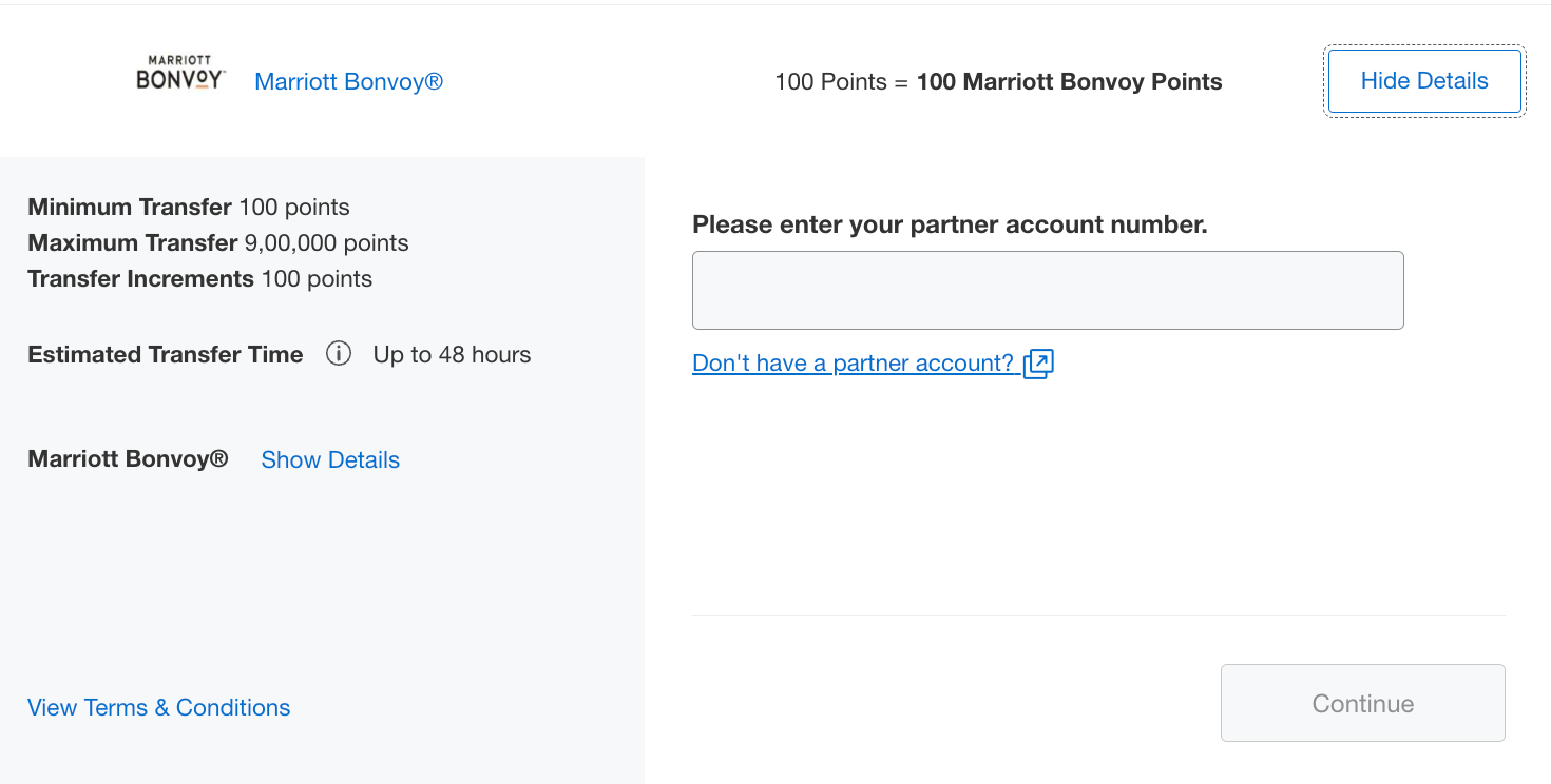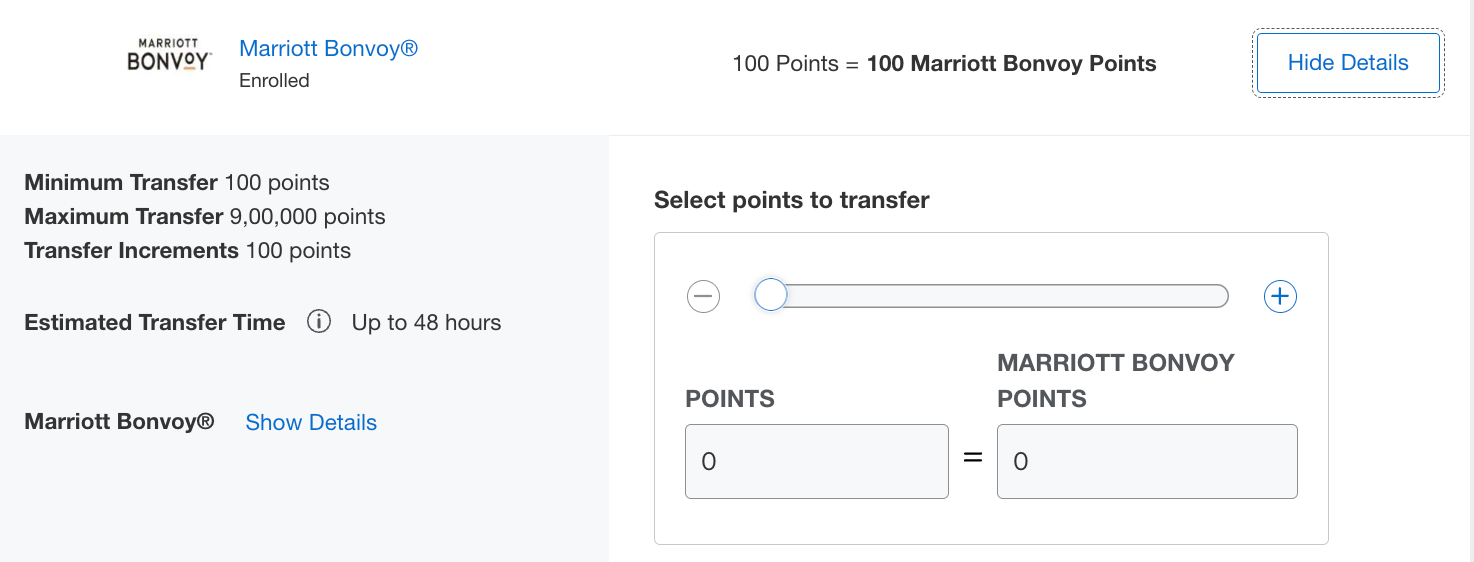 | Min. Points to transfer | 100 (point transfers must be made in multiples of 100 points) |