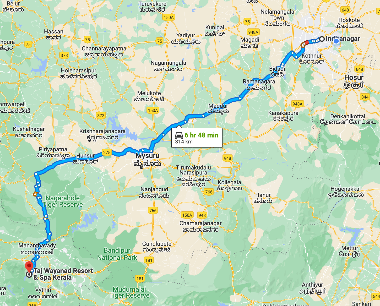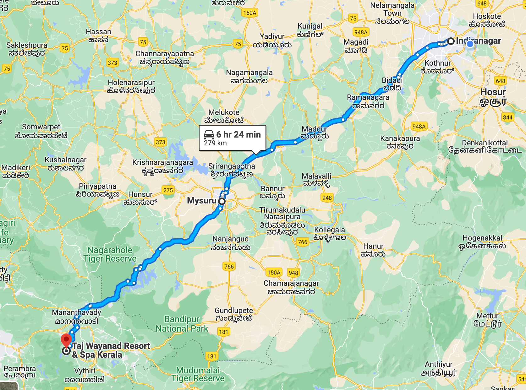 | Route 2 | BLR to Mysore via NH 275 > Mysore to Wayanad via Nagarhole Tiger Reserve through SH 33 & SH 54 |